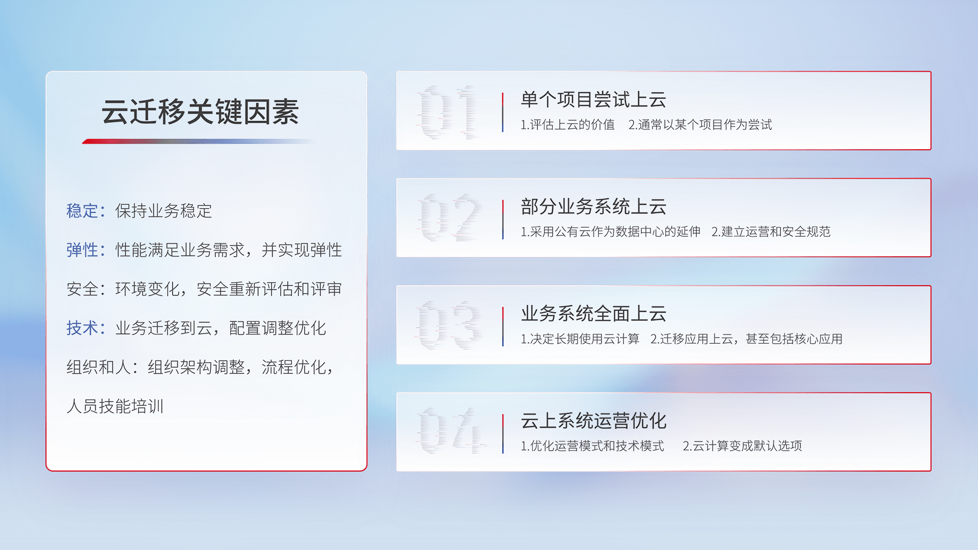 结合实际业务,,,从规划设计、、云平台选型、、、云原生改造、、、数据迁移、、、集成交付,,迁移全过程为客户识别最佳上云路径,,,,做好风险识别管理,,设计网络架构、、、、身份权限、、、、安全审计合规、、操作审计、、、、日志审计、、、、监控告警策略、、、多站点容灾设计等,,,,对云上基础设施进行整体规划,,,提升IT治理水平,,以满足弹性、、、、高可用、、高性能的需求。。