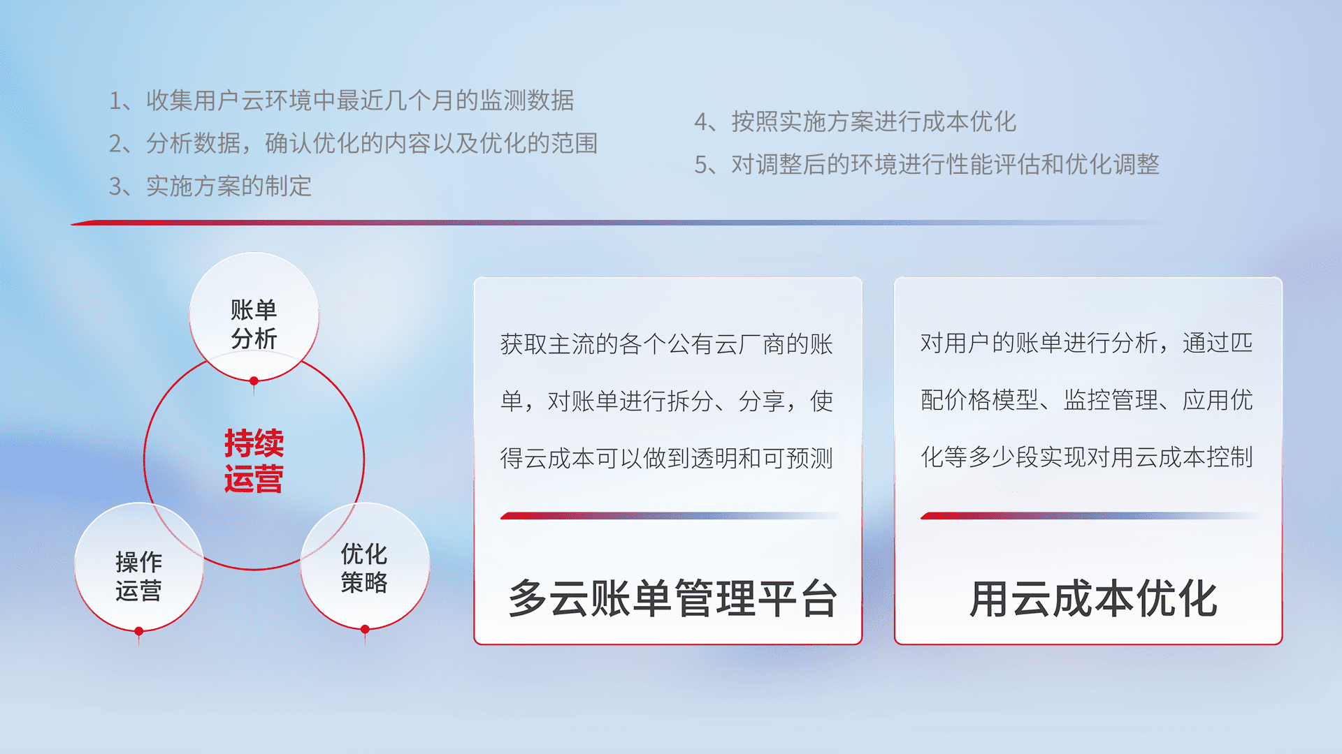 通过多云纳管,,以统一的资源数据模型把客户的云资源进行抽象和封装,,进而实现对多云资源的统一操作,,,,保障云资源管理的可靠性、、、稳定性与可用性。。。。量身定制化运维内容,,,配置、、开发运维、、补丁管理、、备份、、、、监控、、认证和访问管理、、审计和日常巡检等,,,保障在用云过程中的可靠度,,,稳定度以及高可用率。。。